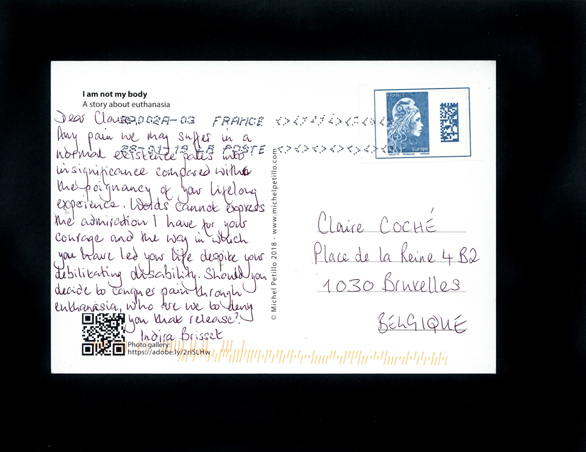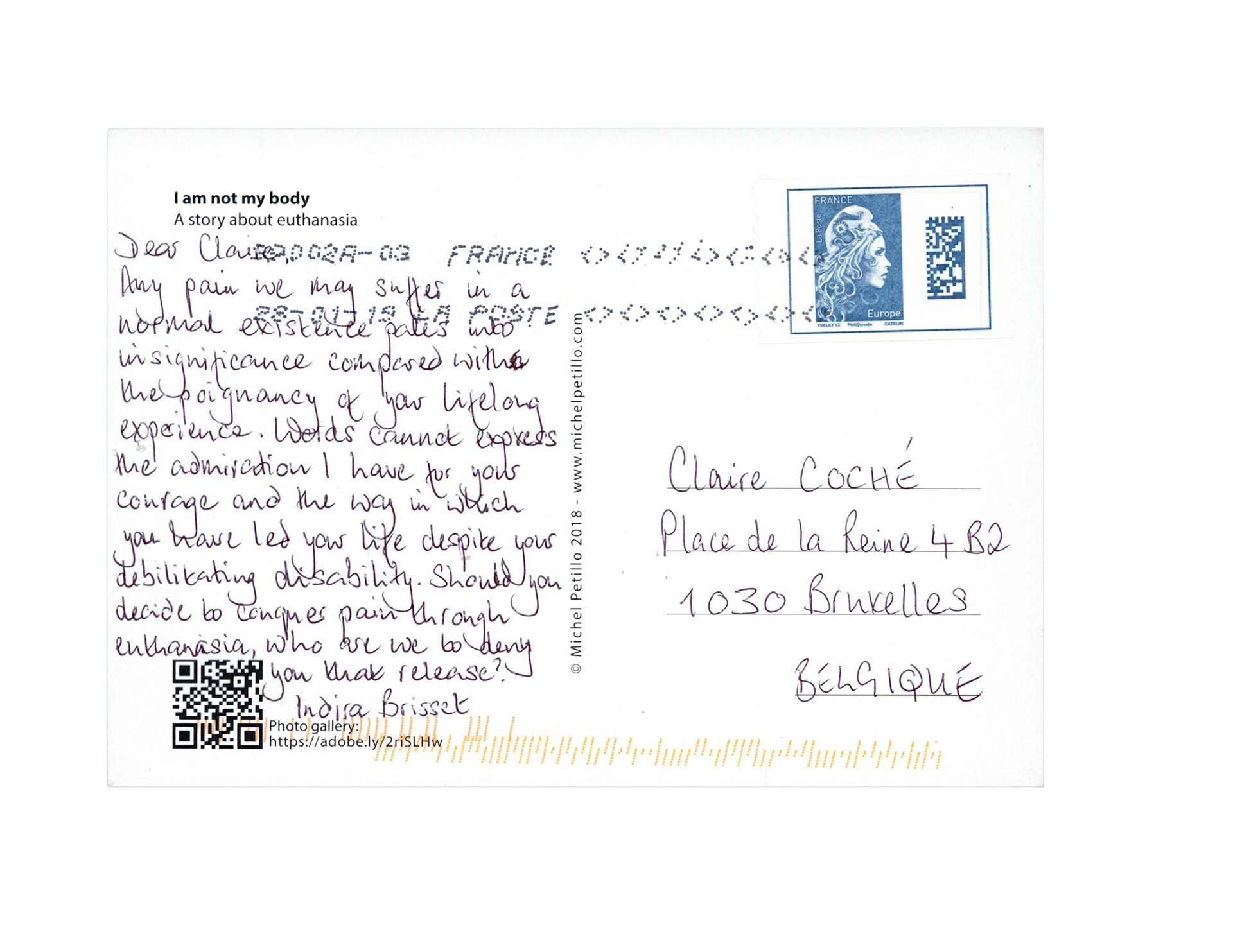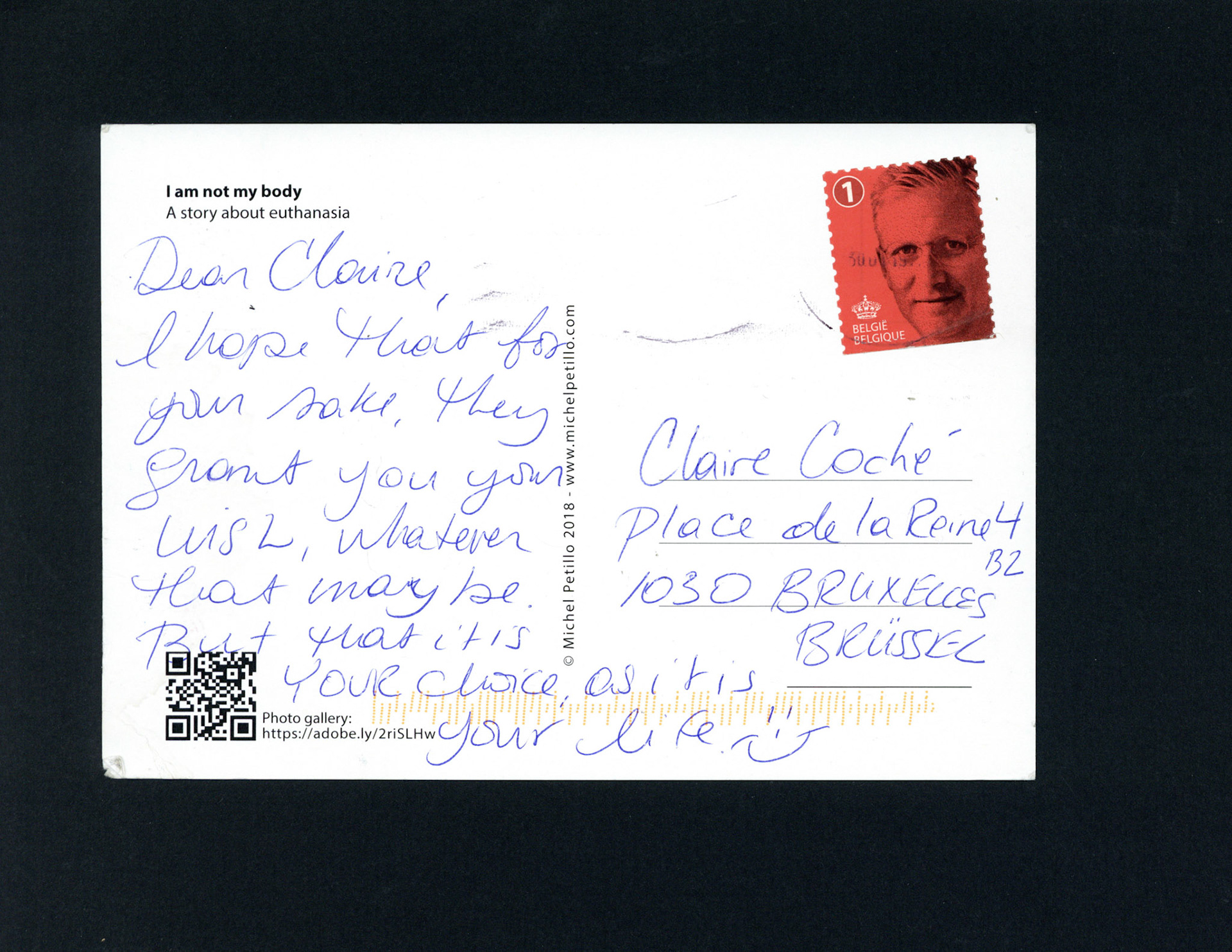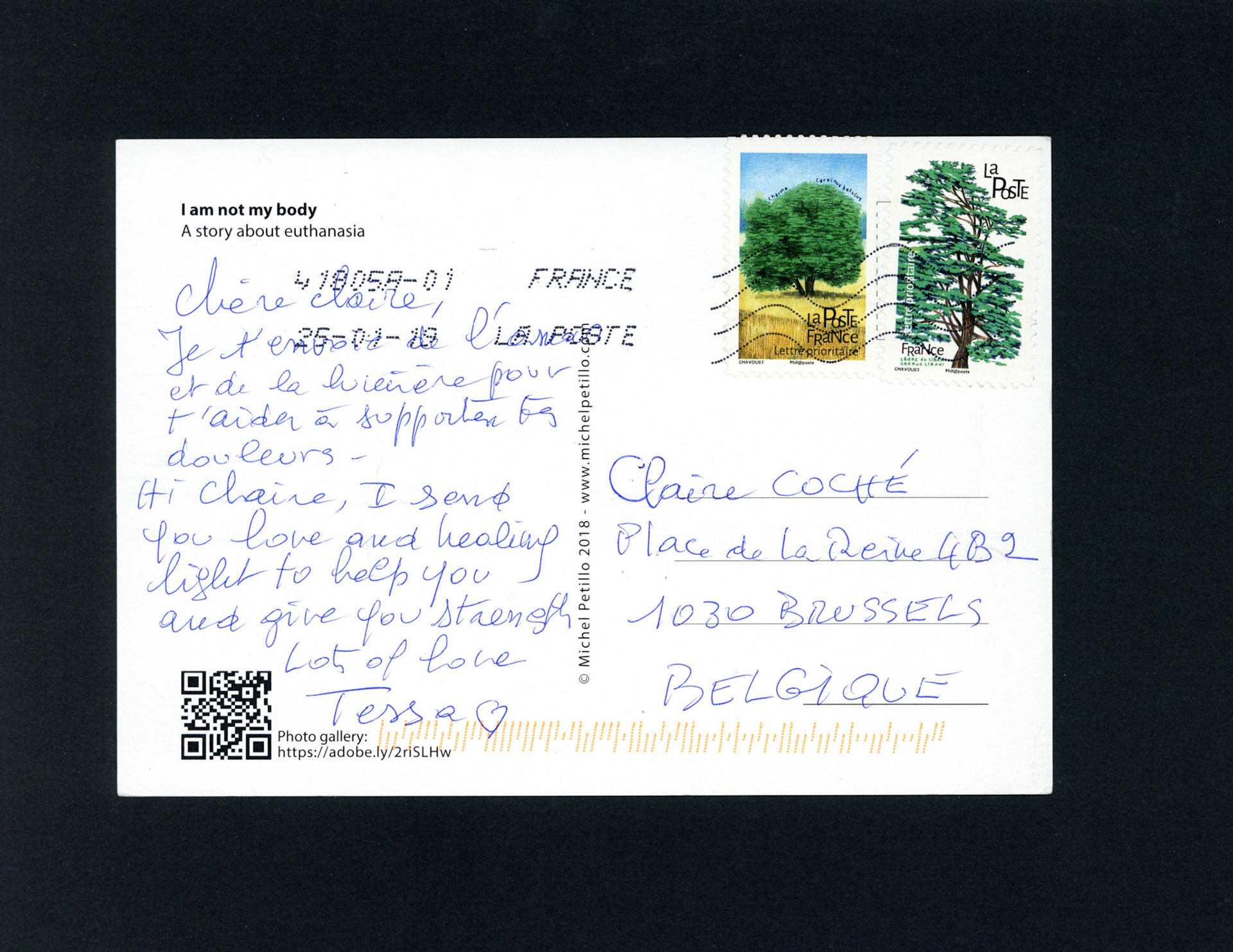 This is one postcard of a larger series of postcards that were sent into the world to capture people's perception when confronted with Claire's struggle. On the front of each postcard there is a picture of claire.