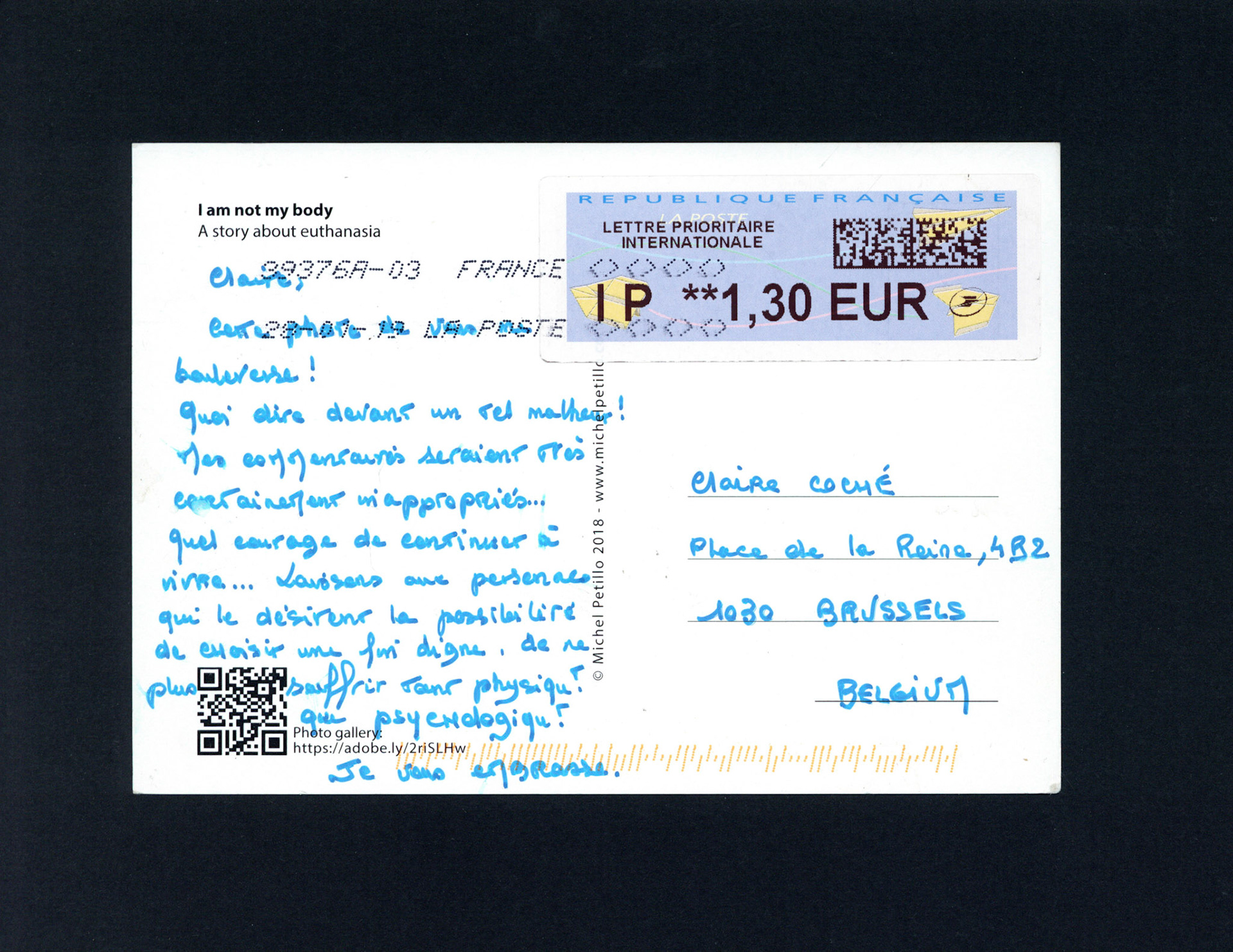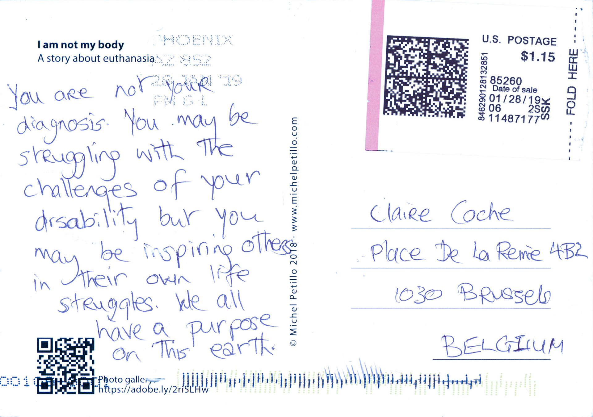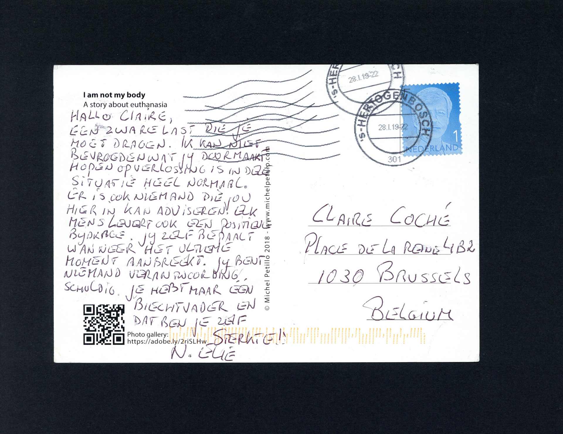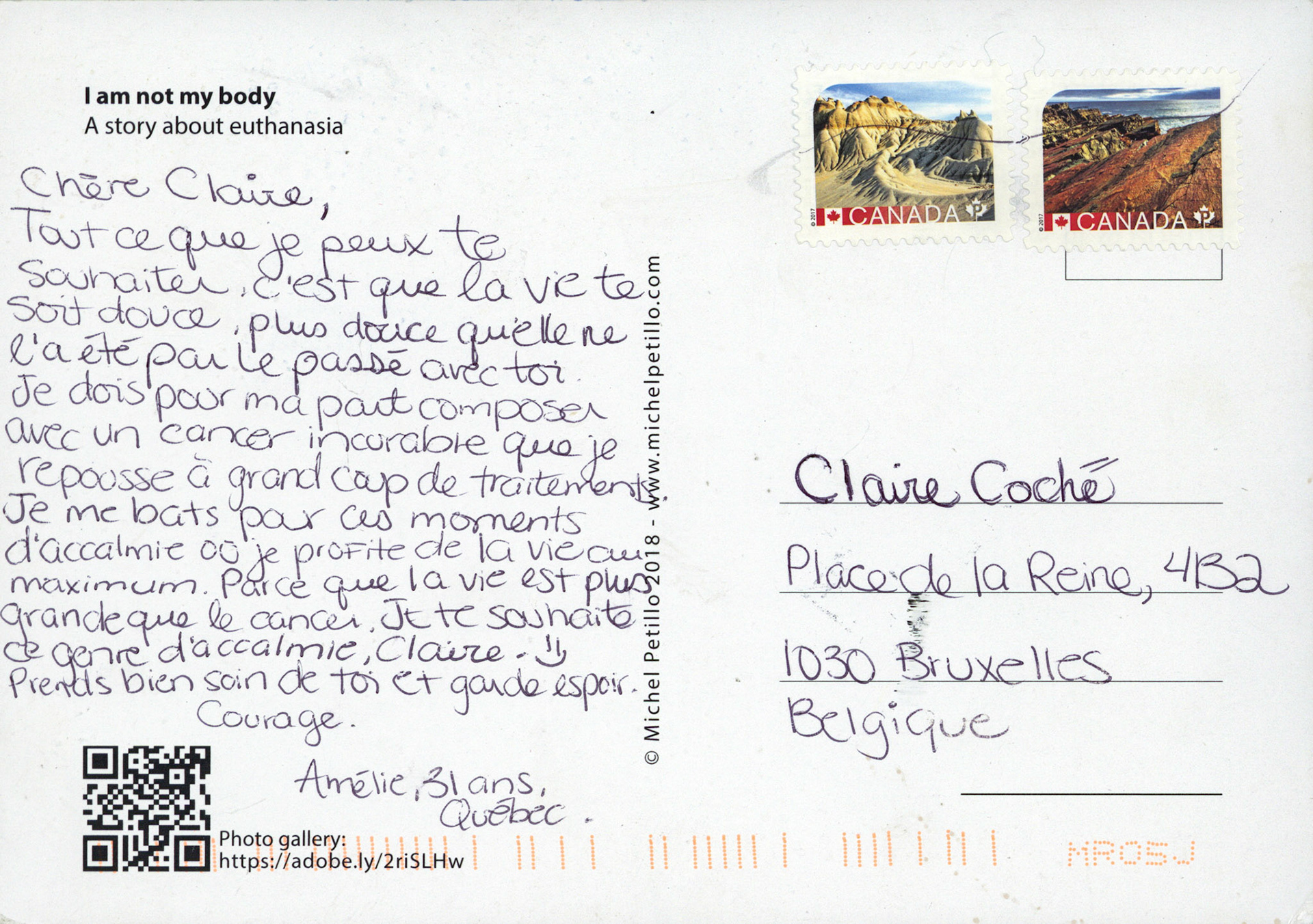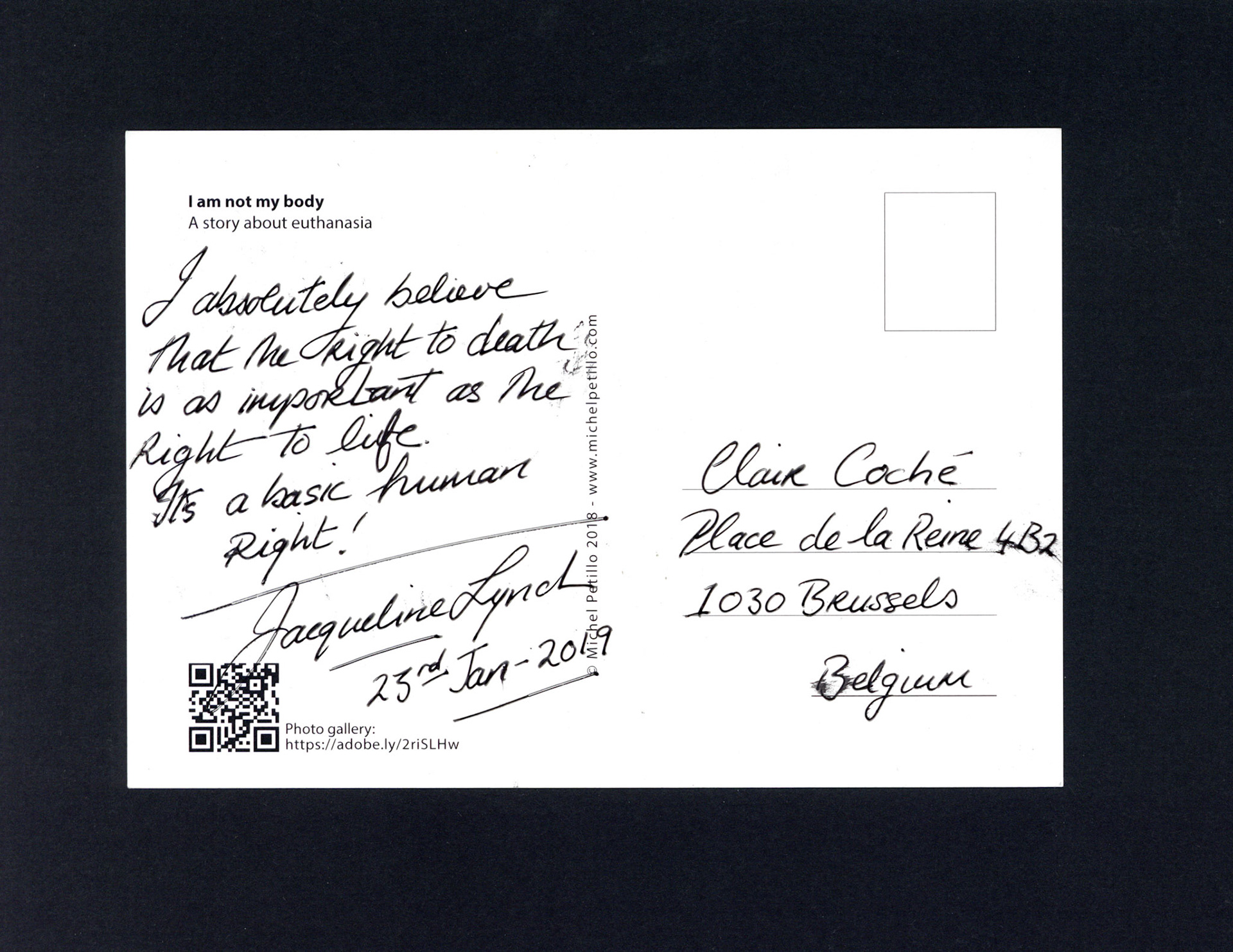 This is one postcard of a larger series of postcards that were sent into the world to capture people's perception when confronted with Claire's struggle. On the front of each postcard there is a picture of claire.