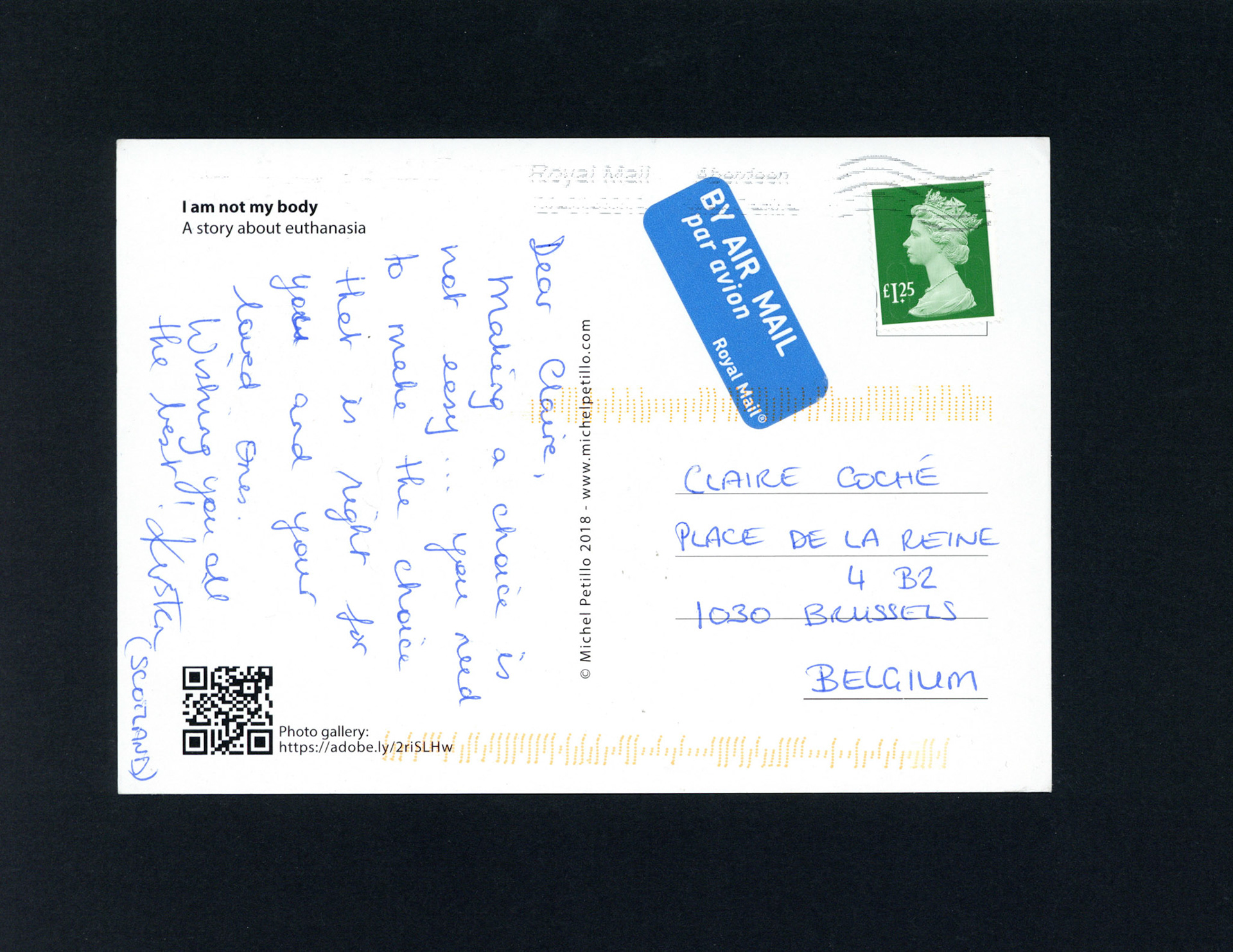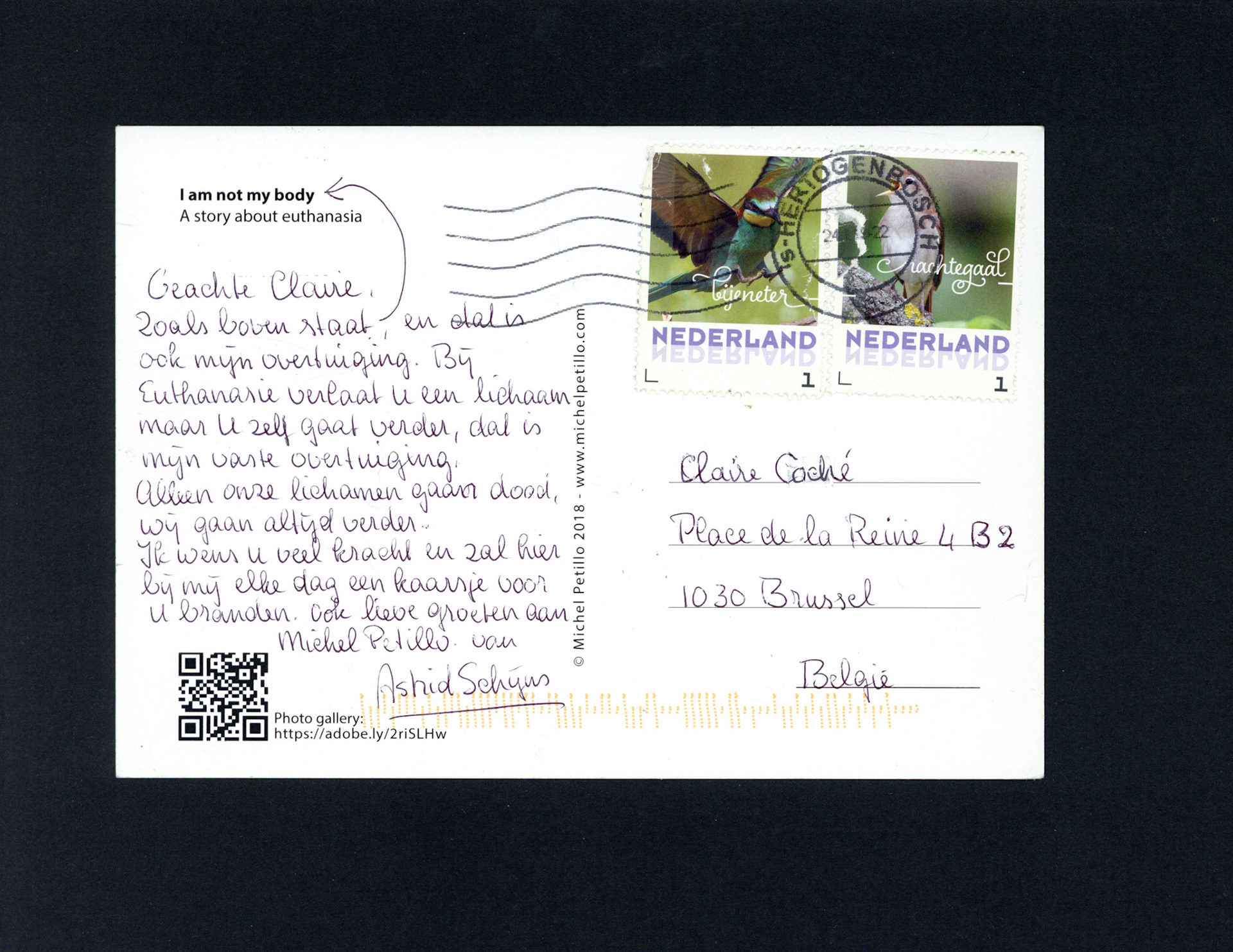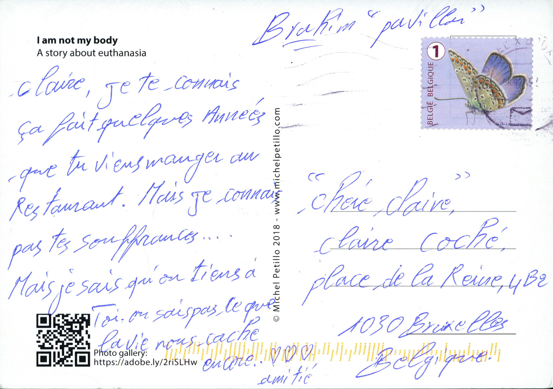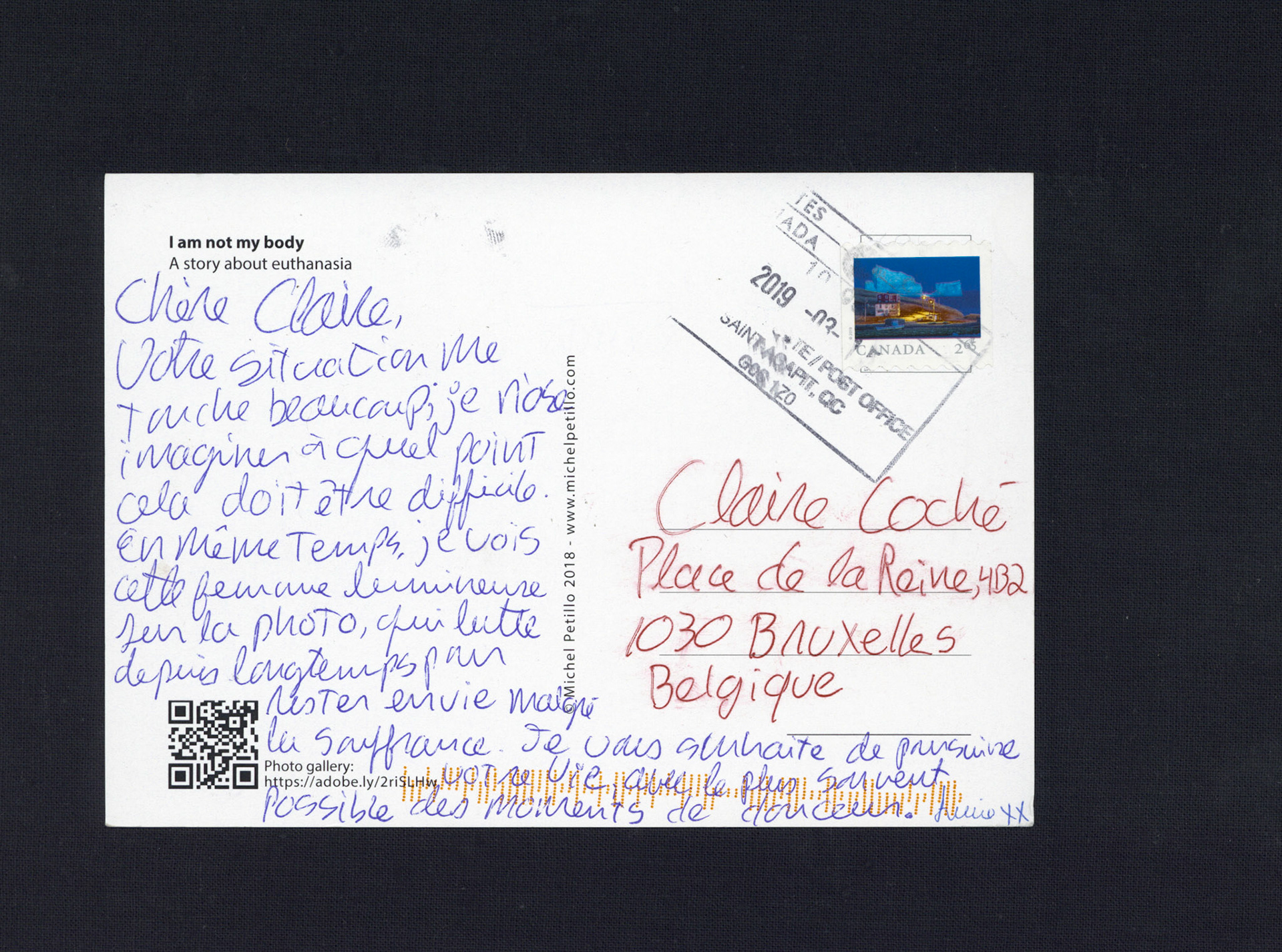 This is one postcard of a larger series of postcards that were sent into the world to capture people's perception when confronted with Claire's struggle. On the front of each postcard there is a picture of claire.
