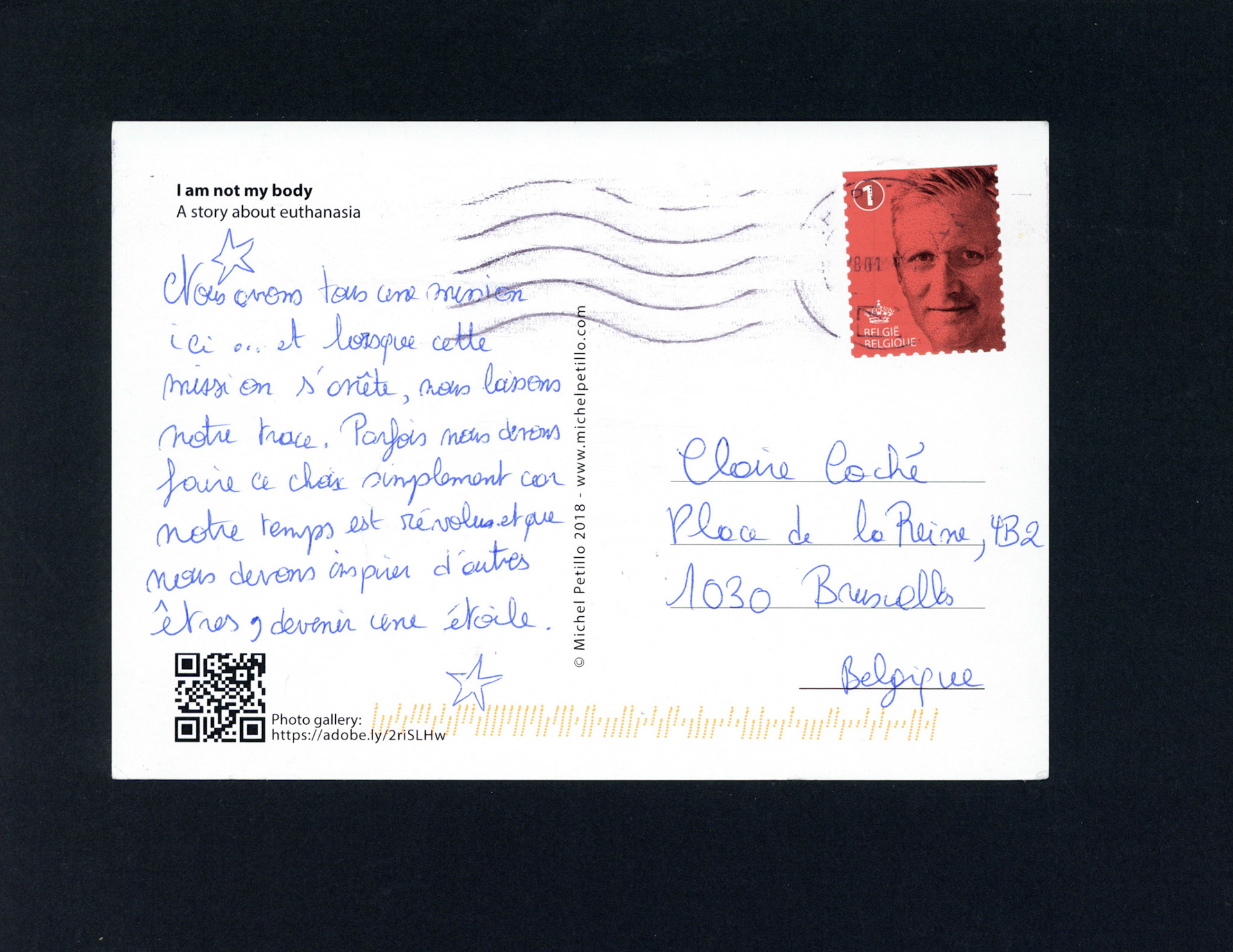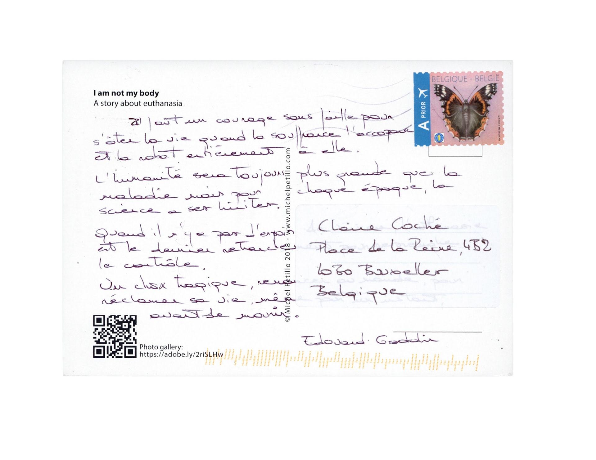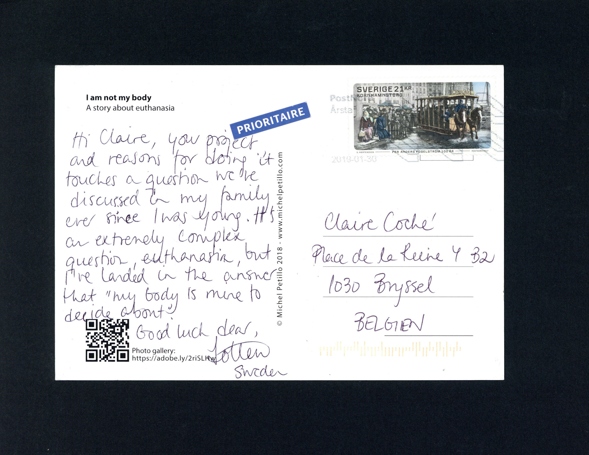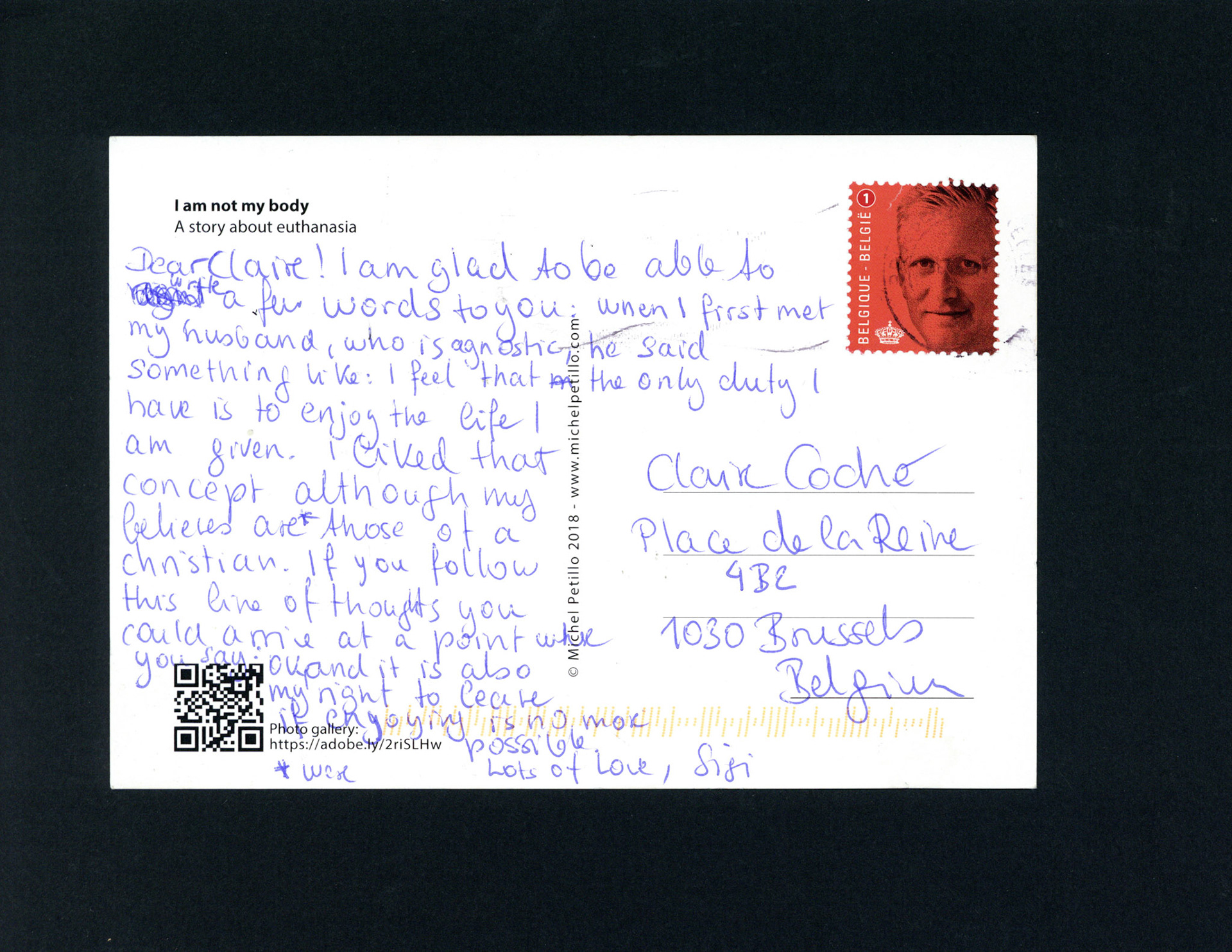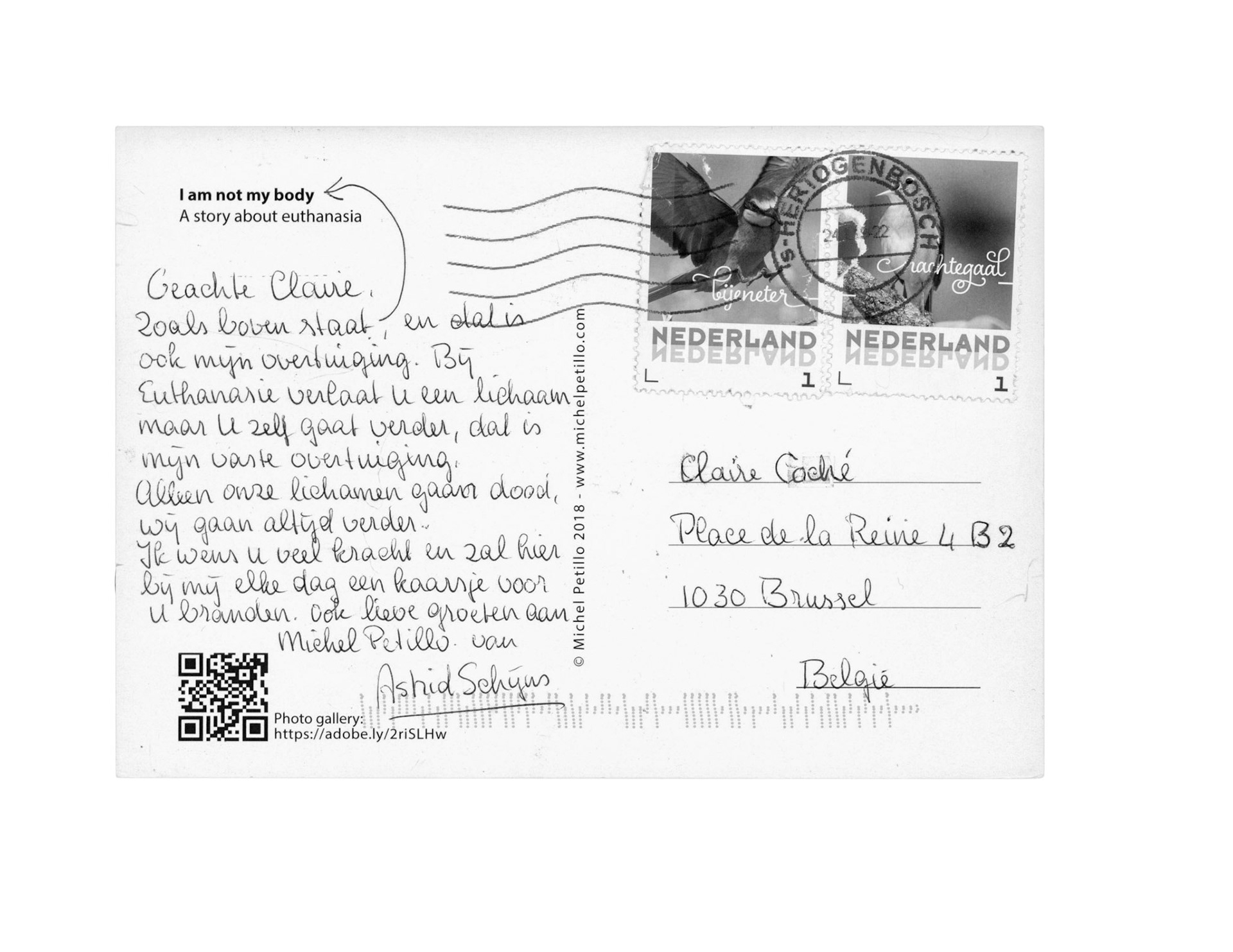 This is one postcard of a larger series of postcards that were sent into the world to capture people's perception when confronted with Claire's struggle. On the front of each postcard there is a picture of claire.