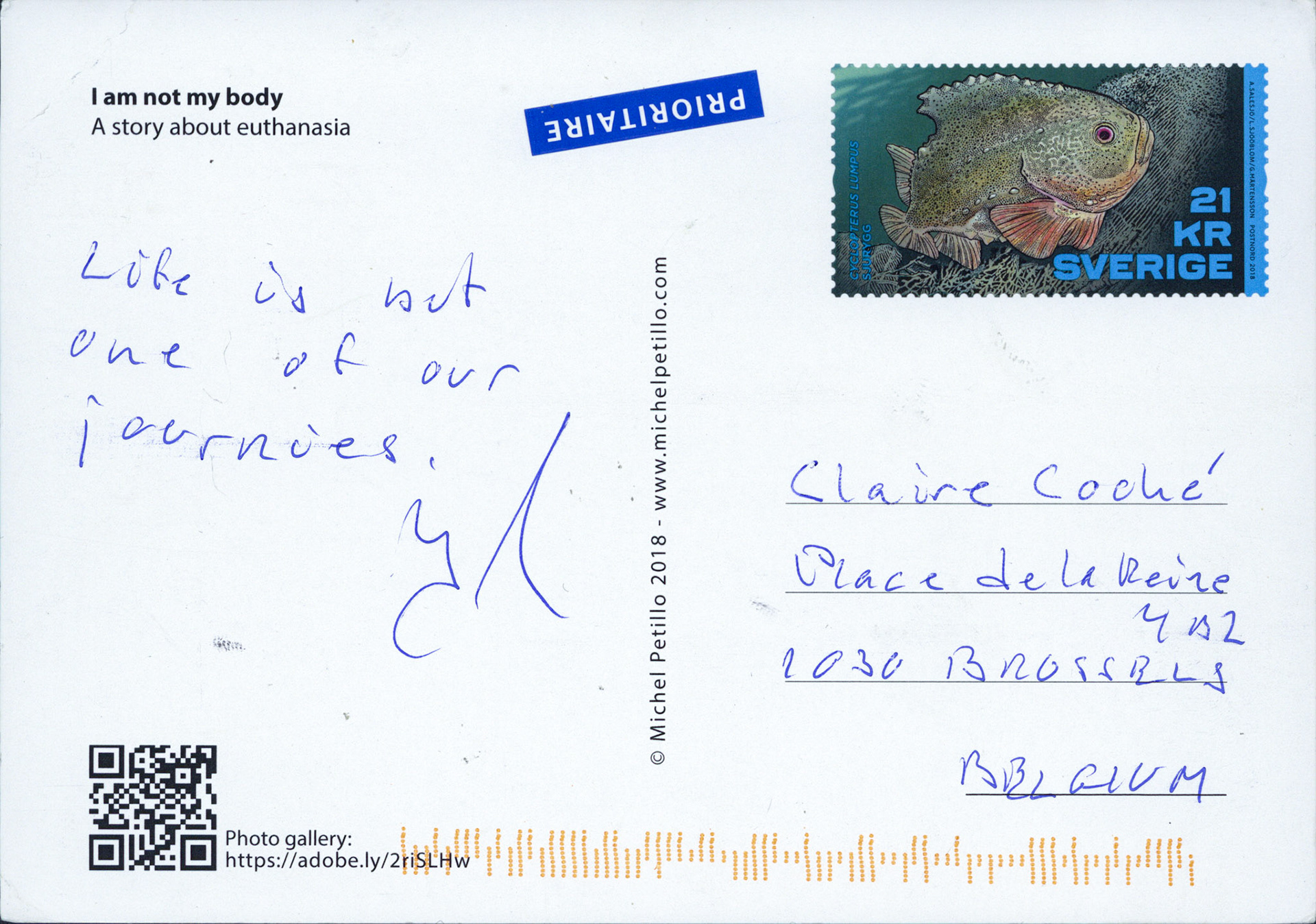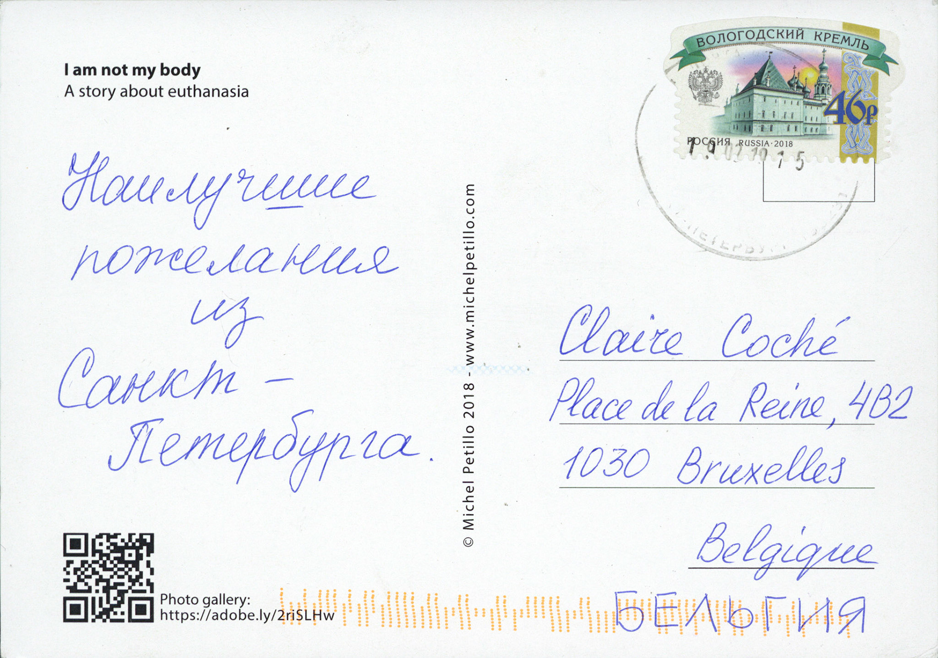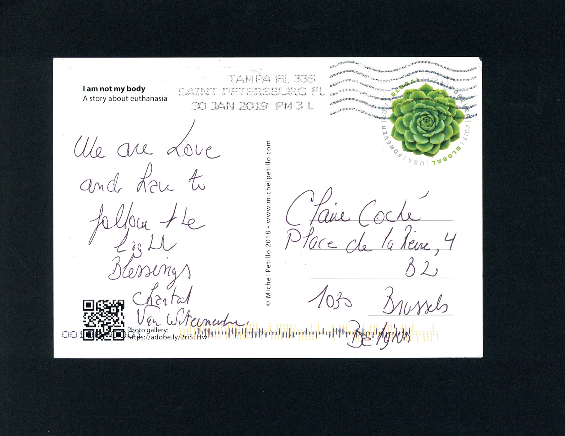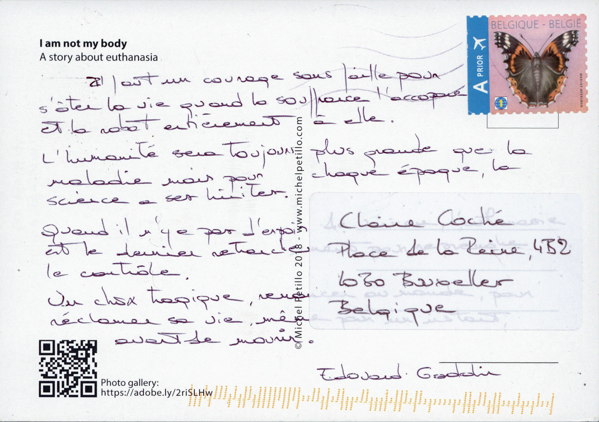 This is one postcard of a larger series of postcards that were sent into the world to capture people's perception when confronted with Claire's struggle. On the front of each postcard there is a picture of claire.